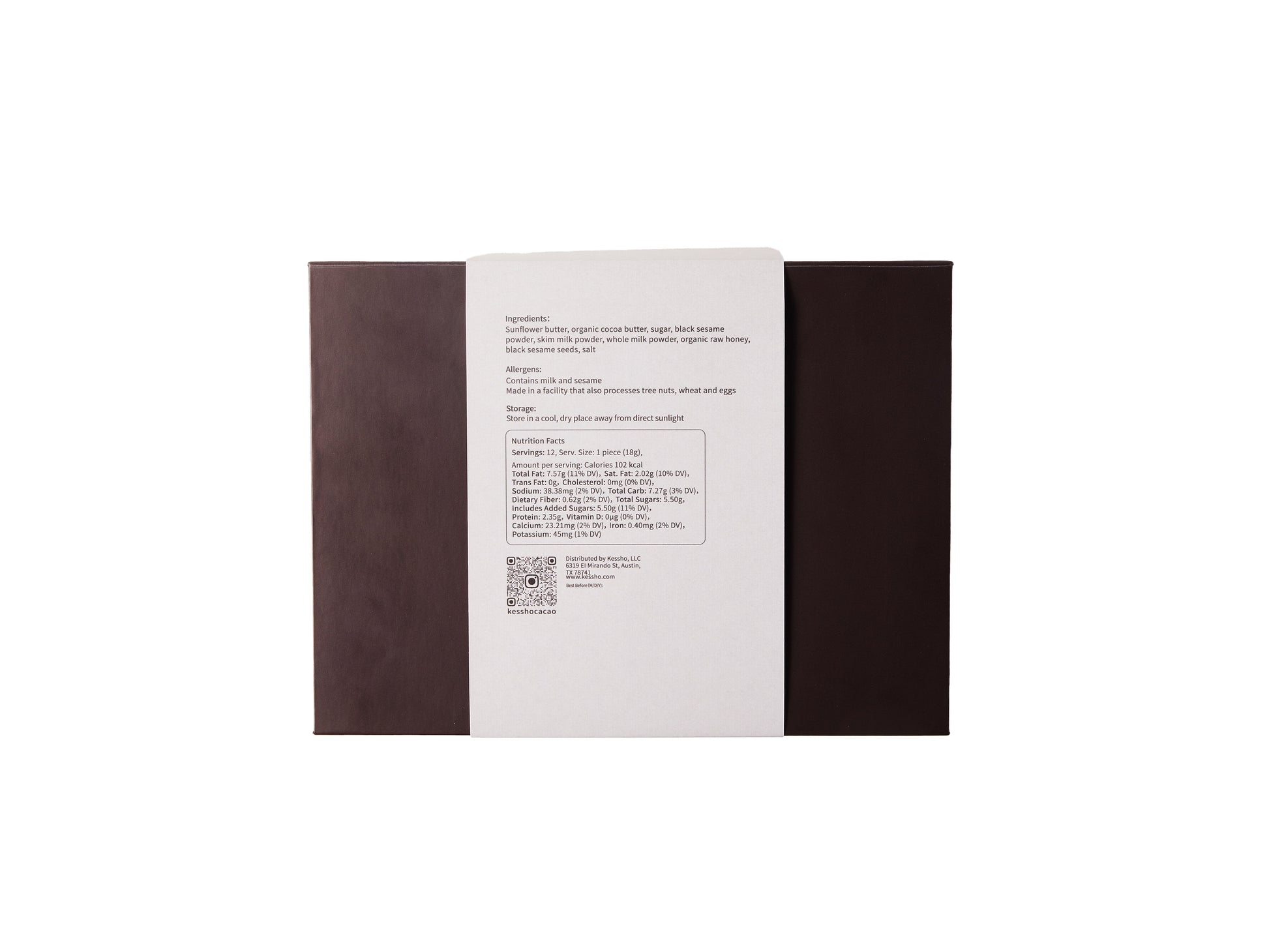 Ingredients: Sunflower butter, organic cocoa butter, sugar, black sesame powder, skim milk powder, whole milk powder, organic raw honey, black sesame seeds, salt
